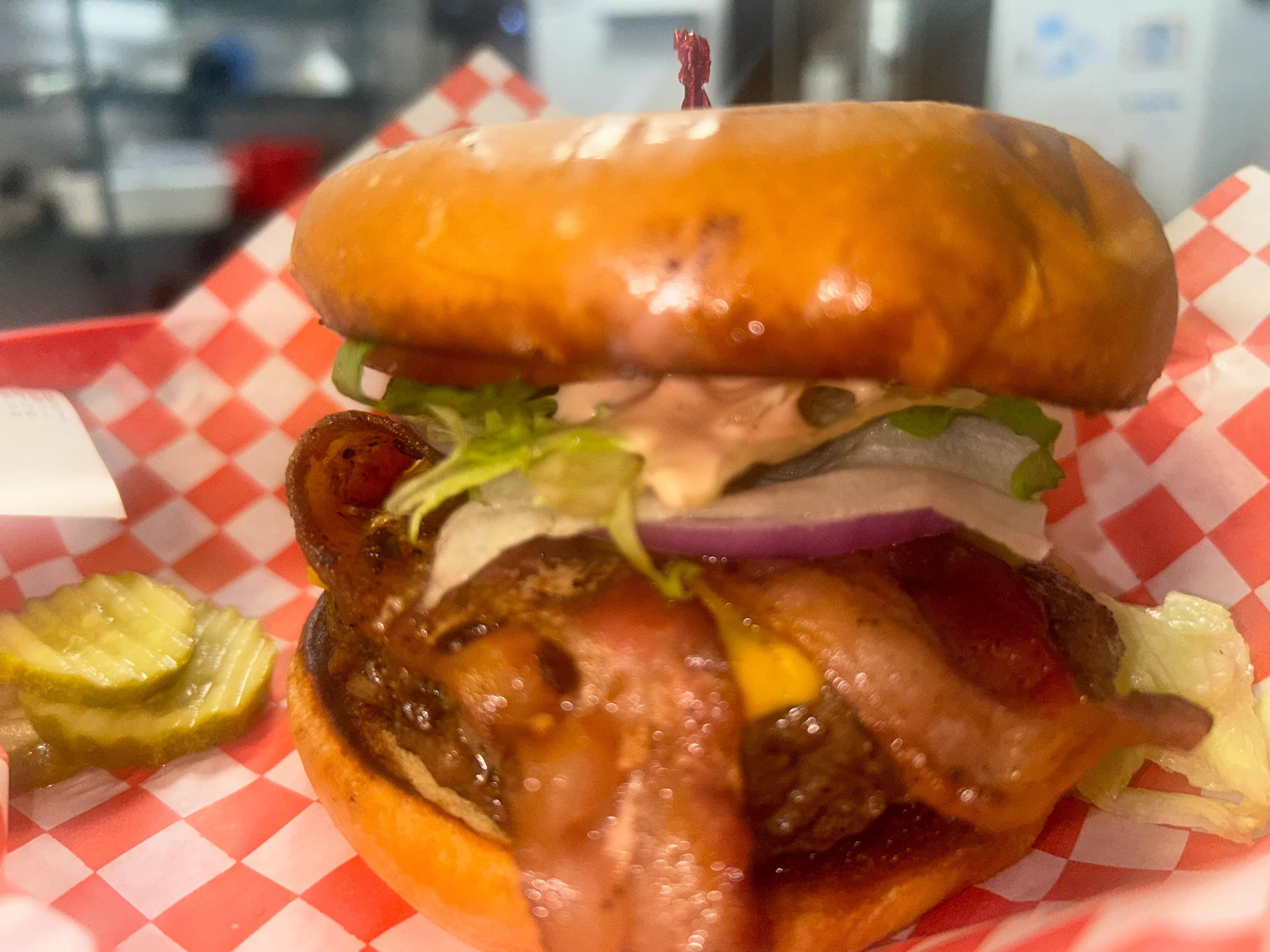 Two 1/4Lb Smashed Beef Patties, Cheddar Cheese, And Bacon On A Glazed, Grilled Doughnut. Just Do It!!!. No Substitutions.