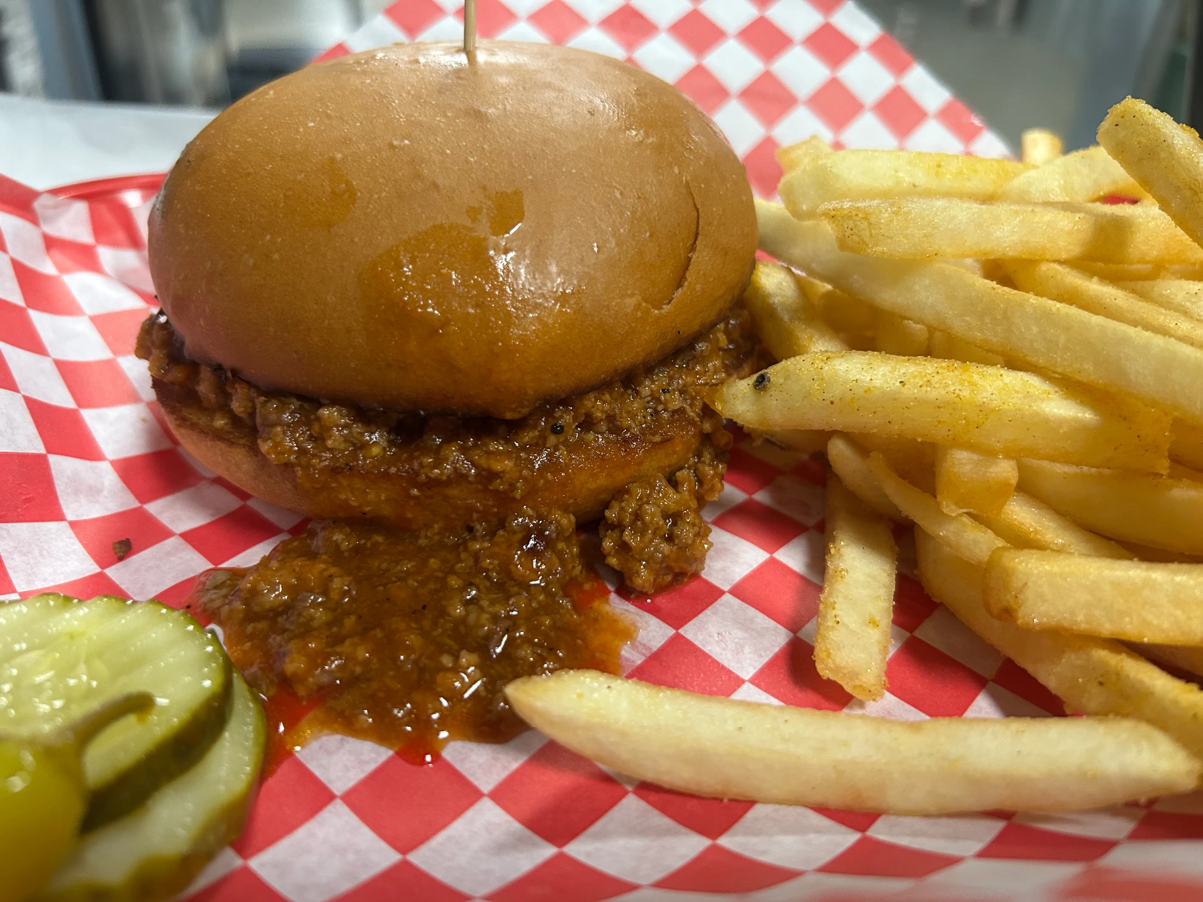 A Generous Portion Of Our House Seasoned Fries Topped With Sloppy Joe, Shredded Cheddar, Diced Grilled Onion With Our Haven Burger Sauce Drizzle. Pickles And Yellow Chiles On The Side.